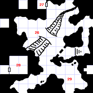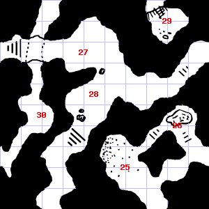 | 25 | An acrid smell assails your nostrils. Encounter: Traders (8) Treasure: As per monster type. | 26 | There are cracks in the ceiling here. | 27 | There is a pile of dung here. |