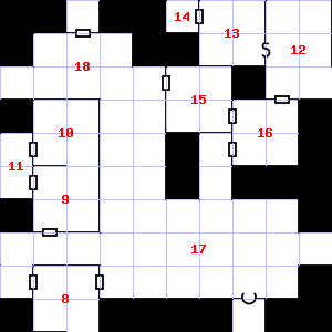 | 7 | This area has a pleasant, earthy smell. The remnants of a rope are here, rotten. | 8 | This area smells of rotting vegetation. Fog gathers and swirls on the floor, concealing it. The hilt of a broken dagger is lying here. | 9 | The hilt of a broken dagger is lying here. Treasure: 100sp. |