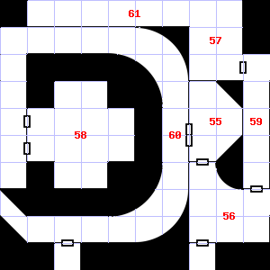 | 58 | 59 | A slight updraft blows through this area. This area has a pleasant, earthy smell. The wall here is damp. Treasure: 100sp. | 60 | Fog gathers and swirls on the floor, concealing it. This area is covered in rubble and dirt. | |
