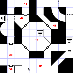 | 37 | A strong, moaning wind blows through this area. This area smells faintly of manure. There is water dripping here. Encounter: Snakes, Cobra (6) Treasure: None. | 38 | 39 | There is a pile of dung here. Encounter: Traders (1) Treasure: None. | |