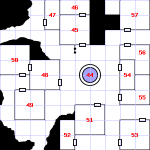 | 46 | This area smells faintly of manure. There is a broken bottle here. Encounter: Green Slimes (3) Treasure: None. | 47 | 48 | The air here is very cold. There are dry leaves and twigs scattered here. Treasure: 500sp. Trap: Spring-fired darts: 1-6 darts hit for 1-4 points of damage each. | |