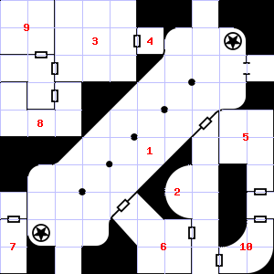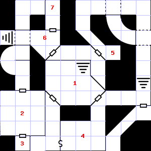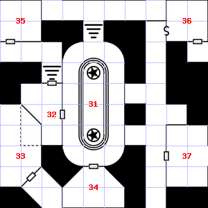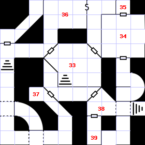 | 31 | This area smells of rotting vegetation. There is a corroded chain here. Encounter: Beetles, Fire (3) Treasure: None. | 32 | This area is covered in cobwebs. Treasure: 100sp, 30gp. | 33 | Encounter: Gnomes (6) Treasure: As per monster type. |
