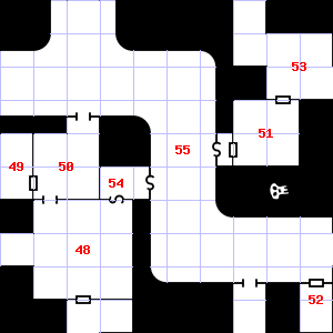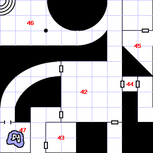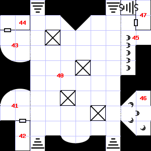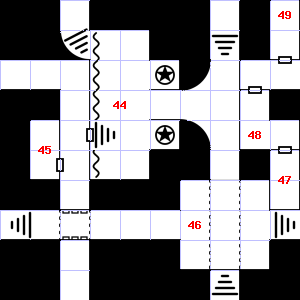 | 46 | There are cracks in the ceiling here. Encounter: Orcs (7) Treasure: None. | 47 | It is misty here. There is water dripping here. | 48 | The air here is very hot. This area smells faintly of manure. There are several small stones here. |