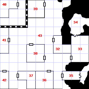 | 43 | Encounter: Orcs (5) Treasure: None. | 44 | This area is very dusty. | 45 | Your nostrils are overwhelmed by a sulphurous smell. Treasure: 200sp. |