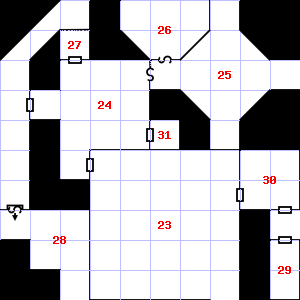 | 25 | A metallic smell assails your nostrils. Treasure: 500sp, 50gp. Trap: Illusion of monsters: Orcs (4) | 26 | There is water dripping here. | 27 | There is water dripping here. |
