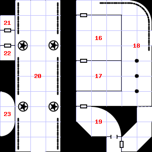 | 16 | A strong, moaning wind blows through this area. There are cracks in the ceiling here. Encounter: Gnomes (6) Treasure: As per monster type. | 17 | This area smells faintly of manure. This area is covered in cobwebs. | 18 | |