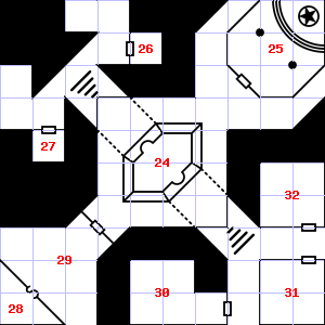 | 25 | 26 | A slight downdraft blows through this area. Trap: Pendulum blade from ceiling: 1d8 points of damage. | 27 | This area is covered in cobwebs. Treasure: 600sp. | |