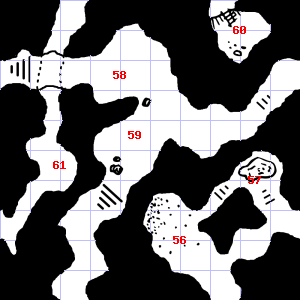 | 55 | A slight downdraft blows through this area. This area smells faintly of urine. There is a bent and rusted iron bar here. Encounter: Acolytes (8) Treasure: None. | 56 | There is a trickle of water here. Encounter: Bandits (5) Treasure: As per monster type. | 57 | The remnants of a rope are here, rotten. |