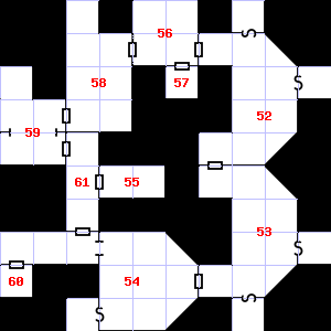 | 49 | Treasure: 300sp. | 50 | This area has a pleasant, earthy smell. Encounter: Spiders, Crab (1) Treasure: None. | 51 | The air here smells of smoke. Encounter: Gnomes (1) Treasure: None. |