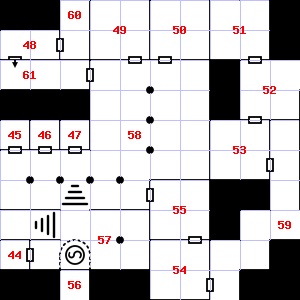 | 43 | 44 | This area smells faintly of manure. Encounter: Dwarves (3) Treasure: None. | 45 | Trap: Ceiling Block falls: Save vs. turn to Stone or take 1d10 points of damage. | |