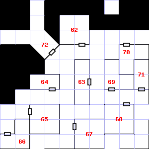| 64 | This area has a pleasant, earthy smell. This area is very dusty. Treasure: 300sp, 50gp. | 65 | Fog gathers and swirls on the floor, concealing it. Encounter: Shrews, Giant (4) Treasure: None. | 66 | There are bits of fur and hair scattered around here. |