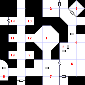 | 1 | This area has a stale, fetid smell. | 2 | There are cracks in the floor here. Treasure: 400sp. Trap: Poison needle: Save vs. Poison or die. | 3 | |
