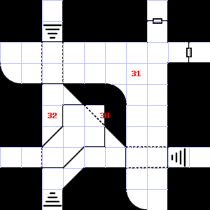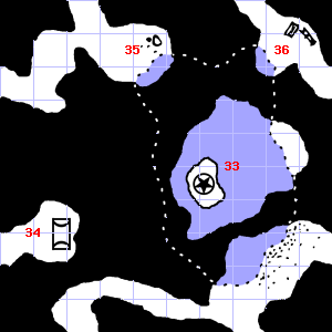 | 34 | Treasure: 400sp. | 35 | The smell of ozone assails your nostrils. It is misty here. Trap: 10' Pit: 1d6 points of damage if you fall in. | 36 | |