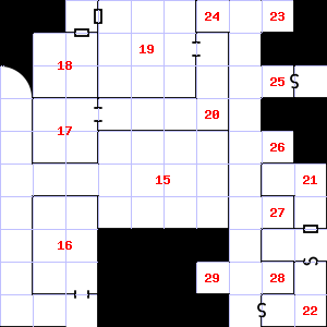 | 16 | It is misty here. This area is covered in cobwebs. | 17 | This area has a pleasant, earthy smell. | 18 | Pottery shards are scattered here. |