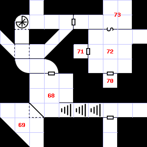 | 67 | Encounter: Killer Bees (3) Treasure: None. | 68 | There is a putrid smell coming from something nearby. There are cracks in the ceiling here. Encounter: Lizards, Gecko (3) Treasure: None. | 69 | This area is very dusty. Treasure: 400sp, 20gp, 1 magic item. |