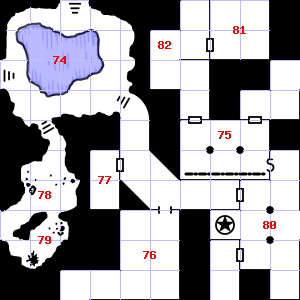 | 76 | Your nostrils are overwhelmed by a sulphurous smell. There is water dripping here. Encounter: Goblins (3) Treasure: None. | 77 | Treasure: 500sp, 20gp. Trap: Spring-fired darts: 1-6 darts hit for 1-4 points of damage each. | 78 | There is dried blood here. |
