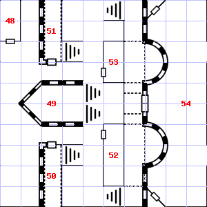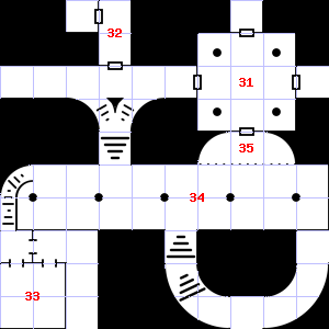 | 31 | 32 | The air here smells of smoke. The hilt of a broken dagger is lying here. Encounter: Acolytes (3) Treasure: None. | 33 | A slight, damp breeze blows through this area. This area is covered in rubble and dirt. Trap: Poison gas: Save vs. Poison or die. | |