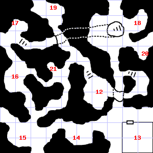 | 13 | A strong updraft blows through this area. This area smells faintly of manure. There are sticks scattered here. | 14 | The air here is very hot. This area smells faintly of manure. There is a torn leather boot here. | 15 | Fog gathers and swirls on the floor, concealing it. There is a bent and rusted iron bar here. |