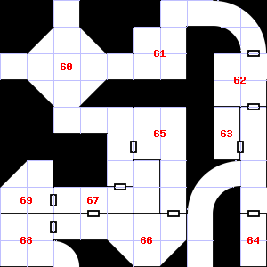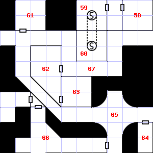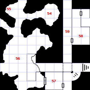 | 58 | 59 | There is a large puddle of water here. | 60 | Fog gathers and swirls on the floor, concealing it. This area is covered in cobwebs. Treasure: 300sp. Trap: Spray: Unknown liquid that attracts Wandering Monsters; double chances for 1d6 hours. | |