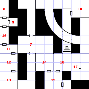 | 7 | The smell of ozone assails your nostrils. There are wax drippings here. | 8 | There is a small puddle of water here. Encounter: Sprites (15) Treasure: None. | 9 | |