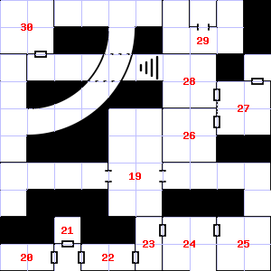 | 28 | A slight breeze blows through this area. There are cracks in the ceiling here. Encounter: Killer Bees (10) Treasure: None. | 29 | Your nostrils are overwhelmed by a sulphurous smell. There are food scraps scattered here. | 30 | It is foggy here, making it difficult to see. Encounter: Shrews, Giant (3) Treasure: None. |