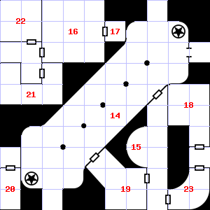 | 19 | This area has a pleasant, earthy smell. There is a large puddle of water here. Trap: Poison gas: Save vs. Poison or die. | 20 | There are cracks in the floor here. | 21 | There is a torn leather boot here. |