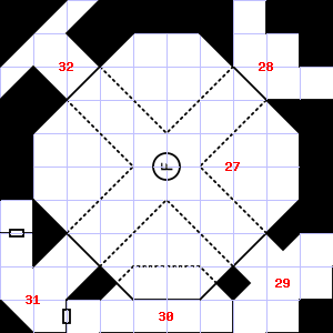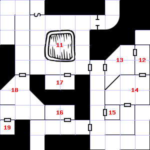 | 16 | This area is very dusty. Treasure: 200sp. Trap: Poison needle: Save vs. Poison or die. | 17 | The smell of ozone assails your nostrils. Trap: Poison gas: Save vs. Poison or die. | 18 | There are rotting wood pieces here. |