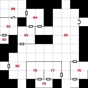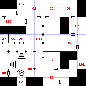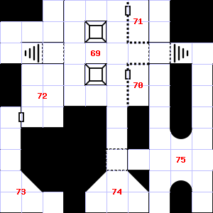 | 73 | This area is covered in cobwebs. Encounter: Orcs (7) Treasure: None. | 74 | A haze of smoke hangs in the air. There is a trickle of water here. | 75 | A slight breeze blows through this area. |