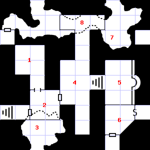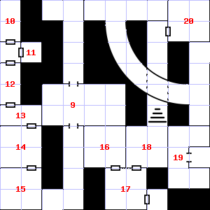 | 7 | This area smells faintly of manure. Trap: Poison gas: Save vs. Poison or die. | 8 | This area has a pleasant, earthy smell. There is a pile of rags here. | 9 | A strong wind blows through this area. A haze of smoke hangs in the air. There are scratches on the wall here. |