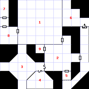 | 4 | The air here smells of smoke. Trap: Fog: Looks like poison gas, but harmless. | 5 | A slight downdraft blows through this area. Treasure: 100sp. Trap: Illusion of monsters: Killer Bees (6) | 6 | A strong downdraft blows through this area. |