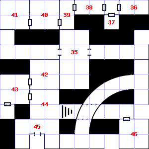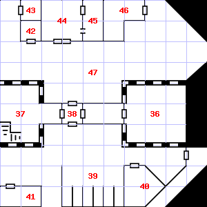 | 43 | 44 | A slight breeze blows through this area. | 45 | This area has a stale, fetid smell. There is a broken sword blade here. Treasure: 300sp, 50gp, 2 jewelry. | |