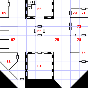 | 73 | Encounter: Spiders, Crab (4) Treasure: As per monster type. | 74 | A strong downdraft blows through this area. This area smells faintly of manure. There are cracks in the wall here. Encounter: Lizards, Gecko (1) Treasure: None. | 75 | Treasure: 400sp, 40gp, 3 gems. |
