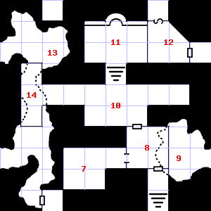 | 25 | A cold air current blows through this area. This area smells of rotting vegetation. Encounter: Traders (8) Treasure: None. | 26 | This area has a pleasant, earthy smell. There are cracks in the ceiling here. | 27 | A strong wind blows through this area. Your nostrils are overwhelmed by a sulphurous smell. Trap: Chute: No damage, but slide to the next level down (ignore if there is no lower level). |