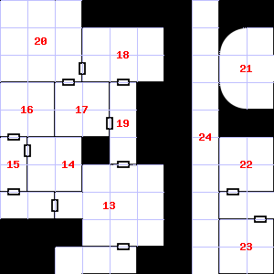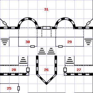 | 25 | A chlorine-like smell assails your nostrils. A haze of smoke hangs in the air. Treasure: 100sp. | 26 | 27 | ||