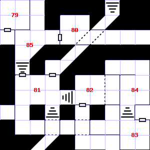 | 82 | There is a pile of straw here. | 83 | An acrid smell assails your nostrils. There are cracks in the wall here. Encounter: Killer Bees (4) Treasure: None. | 84 | Treasure: 100sp, 60gp. Trap: Spring-fired darts: 1-6 darts hit for 1-4 points of damage each. |