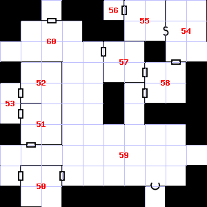 | 55 | The air here is very cold. This area has a stale, fetid smell. | 56 | The wall here is damp. Treasure: 400sp, 30gp. | 57 | It is misty here. |