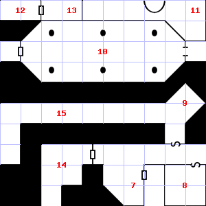 | 13 | A slight updraft blows through this area. Fog gathers and swirls on the floor, concealing it. | 14 | Fog gathers and swirls on the floor, concealing it. Encounter: Gnomes (5) Treasure: None. | 15 | This area has a stale, fetid smell. Treasure: 600sp, 30gp. |
