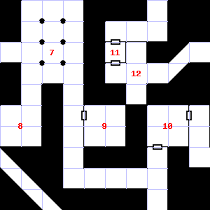 Treasure: As per monster type. | 15 | A slight downdraft blows through this area. This area smells faintly of urine. There are cracks in the floor here.