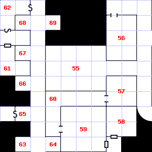 | 58 | There are cracks in the ceiling here. Trap: Fog: Looks like poison gas, but harmless. | 59 | A cold air current blows through this area. This area smells faintly of manure. There is a broken pole here. Encounter: Traders (2) Treasure: None. | 60 | There is a slimy coating on the ceiling here. |