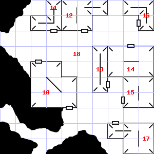 | 16 | It is foggy here, making it difficult to see. | 17 | An acrid smell assails your nostrils. The wall here is damp. Encounter: Traders (2) Treasure: None. | 18 | The air here is very hot. There is a pile of dung here. |