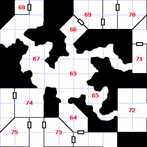 | 73 | There is a bent and rusted iron bar here. | 74 | The smell of ozone assails your nostrils. There are dry leaves and twigs scattered here. Treasure: 200sp. | 75 | There is a blunt javelin head here. Encounter: Shrews, Giant (10) Treasure: None. |