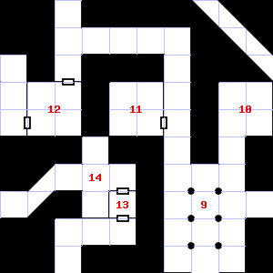 | 10 | This area smells faintly of manure. There is a broken pole here. Encounter: Sprites (9) Treasure: As per monster type. | 11 | There is a slimy coating on the ceiling here. Encounter: Gnomes (4) Treasure: As per monster type. | 12 | A strong, gusting wind blows through this area. This area smells faintly of manure. |