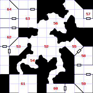 | 64 | A haze of smoke hangs in the air. There is a torn leather boot here. | 65 | There are dry leaves and twigs scattered here. Encounter: Spiders, Crab (3) Treasure: As per monster type. | 66 | The air here smells of smoke. The wall here is damp. |