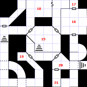 | 19 | This area smells of rotting vegetation. There is a slimy coating on the floor here. Encounter: Goblins (6) Treasure: As per monster type. | 20 | The air here is very cold. | 21 | This area has a pleasant, earthy smell. It is foggy here, making it difficult to see. Encounter: Spiders, Crab (1) Treasure: As per monster type. |