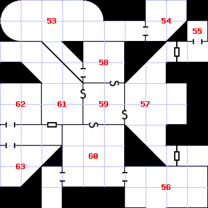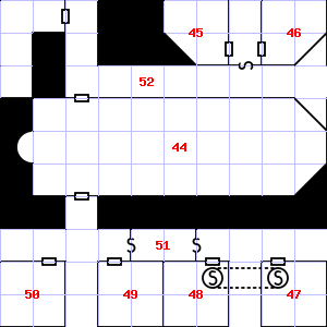 | 49 | Encounter: Shrews, Giant (9) Treasure: None. | 50 | A cold air current blows through this area. There are cracks in the wall here. Treasure: 600sp. | 51 | It is misty here. There is a pile of rags here. |