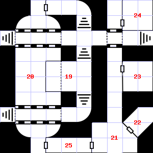 | 19 | 20 | Trap: 10' Pit: 1d6 points of damage if you fall in. | 21 | There is a broken sword blade here. | |