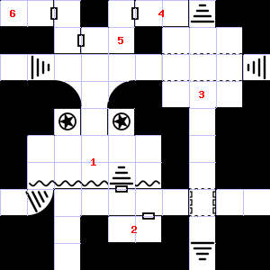 | 52 | A haze of dust hangs in the air. There is a torn leather boot here. Treasure: 600sp, 30gp. | 53 | 54 | Treasure: 400sp, 50gp. Trap: Flash of light: Save vs. Spells or be blinded for 1d8 turns (1d8x10 minutes). | |