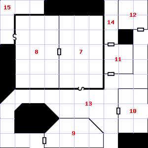 | 13 | There is a slimy coating on the floor here. Encounter: Gnomes (3) Treasure: None. | 14 | Your nostrils are overwhelmed by a sulphurous smell. There are several small stones here. | 15 | There is a blunt javelin head here. |