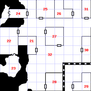 | 19 | This area smells of rotting vegetation. There are cracks in the wall here. Encounter: Wolves (7) Treasure: None. | 20 | A cold air current blows through this area. A metallic smell assails your nostrils. Encounter: Shrews, Giant (10) Treasure: As per monster type. | 21 | Trap: Fog: Looks like poison gas, but harmless. |