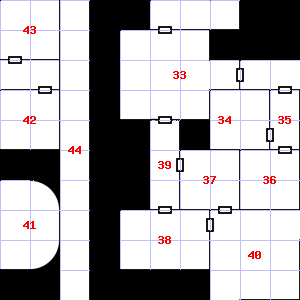 | 40 | 41 | There are bits of fur and hair scattered around here. Encounter: Dwarves (5) Treasure: None. | 42 | This area smells faintly of manure. It is misty here. Encounter: Skeletons (8) Treasure: As per monster type. | |